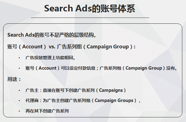 此外,Search Ads账号体系需要特别说明,以前见过很多把账号体系做成层级结构的,其实不然,或者说不严谨。于是我们重新画了张账号体系图。